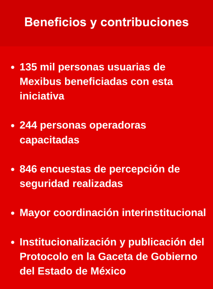 Posterior al éxito en el pilotaje en la línea 1 del Mexibús, la Secretaría de las Mujeres y la Secretaría de Movilidad del Estado de México, anunciaron la publicación del “Protocolo de actuación para atender casos de acoso sexual en el Transporte Público del Estado de México”, en la gaceta de gobierno, elevando el impacto y alcance del protocolo a nivel estatal.